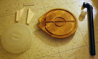 There's the weird carving board, a plastic lid (another lucky thrift store find as it fits perfectly in the groove of the carving board), some PVC pipe (2" diameter) and a 90 degree elbow joint (both from Home Depot). There's a dollar tree airfreshener case (the white tear drop thing by the black pipe) and some wood. There are some other bits and bobs that aren't in this picture (I hadn't figured out what was going to be used at the time): a hinge for the cargo bay ramp, some more wood for the internal walls, screws, nuts/bolts, wood glue, some grey spray paint, a few plastic bottle caps, and the outside case of a CD spindle.