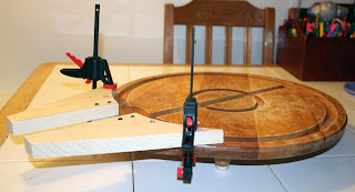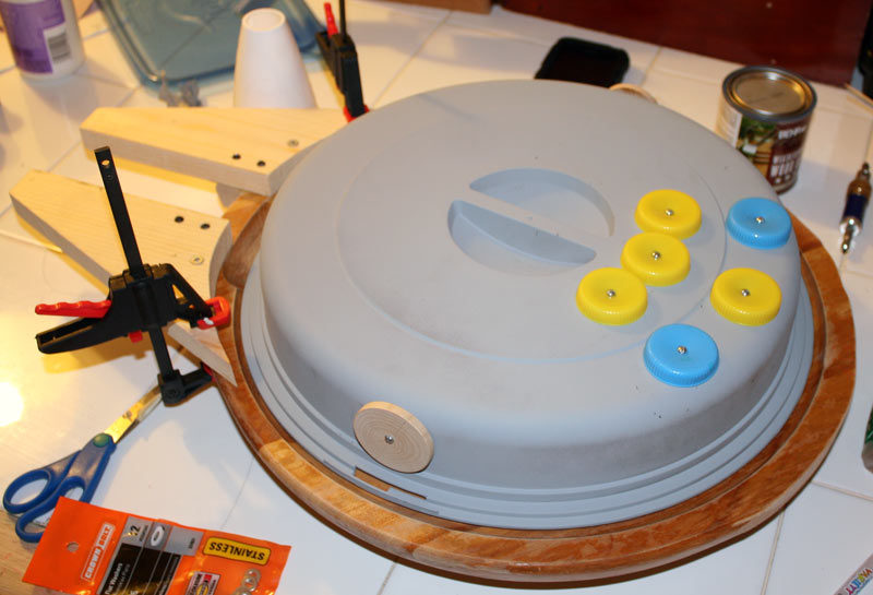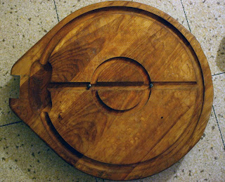 It took us a little while to decide on the components to use. We found this weird wooden board at the local thrift/charity store. I think it's used for carving meat and the grooves capture the juices (there's even a "patent applied for" stamp on the back). I forgot to get a picture of it in its original state; the picture below shows it after a little bit of modification. It was originally symmetrical - I rounded off one of the handles/ears and cut a groove in the other in preparation for adding the front prongs.