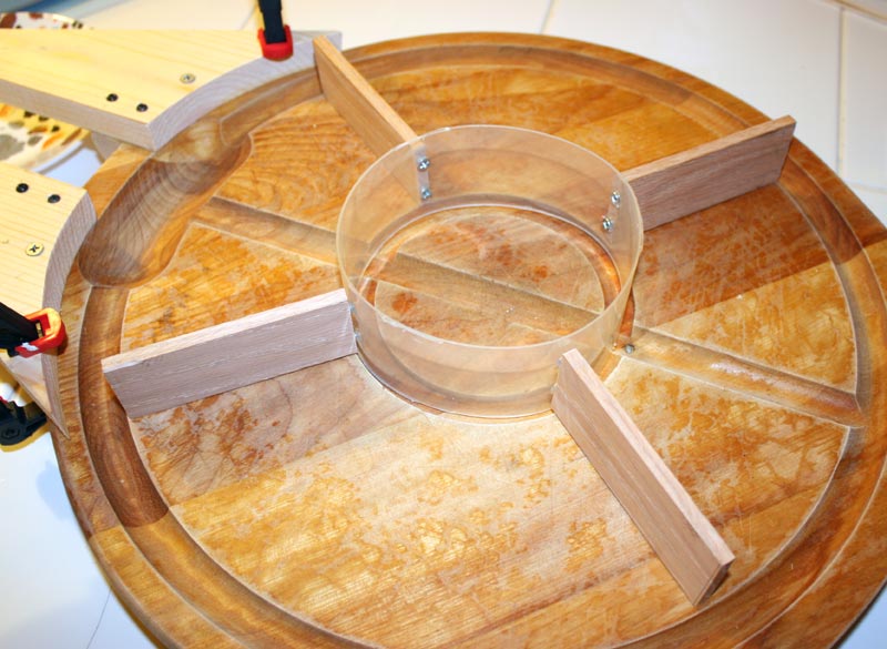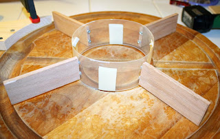 While the glue was drying I made the internal structure. It's made from the outside of a CD spindle and some wooden boards (2" hobby board from Home Depot). I cut the CD spindle to fit the height of the lid and then measured out the boards to fit up to the edge of the curve. That was a bit of a mistake as the lid didn't fit with the boards that long and I ended up having to sand the ends down a bit.