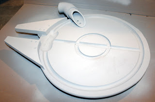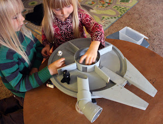 Lin started out making a set of StarWars figures using wooden craft pegs (more about that on her post here). We were going to make a Millenium Falcon using a couple of plastic frisbies, but then thought it'd be nicer to create something a bit larger and more durable so that they could use it with the figures for some make-believe fun.