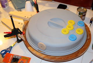 I gave the lid it's first coat of paint, bolted on a few bottle caps and wood disks to mimic some of the structures seen on the original, and then gave it all another coat. The lid needs to be cut in a couple of places to make room for the cockpit attachment/corridor and for the cargo bay ramp.
